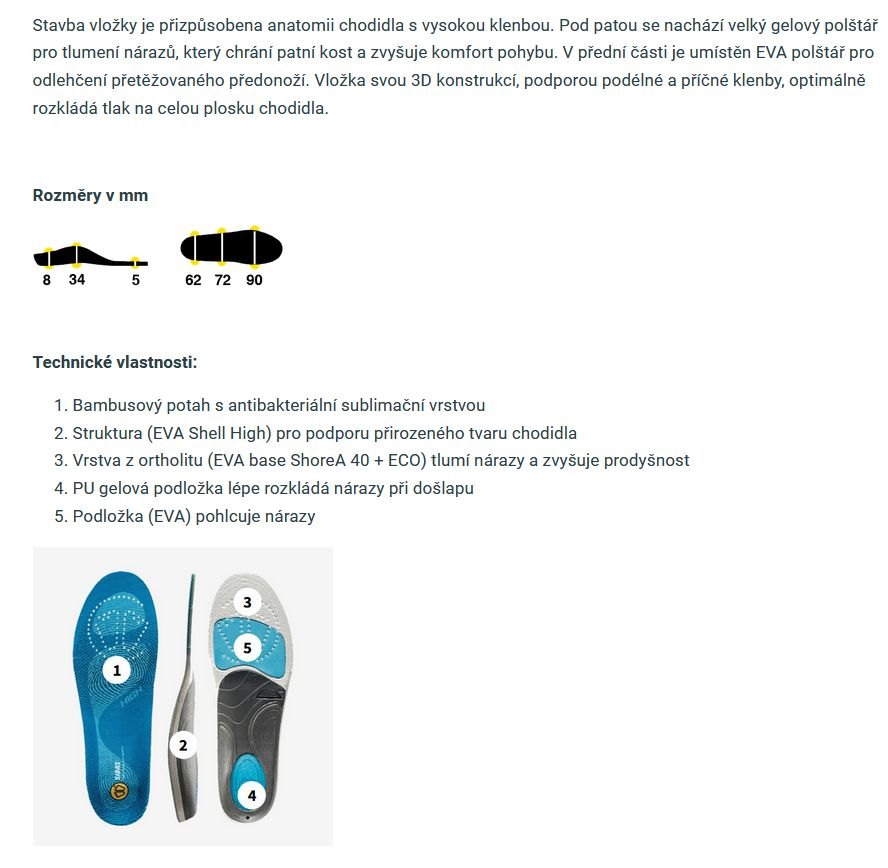 Stavba vložky je přizpůsobena anatomii chodidla s vysokou klenbou. Pod patou se nachází velký gelový polštář pro tlumení nárazů, který chrání patní kost a zvyšuje komfort pohybu. V přední části je umístěn EVA polštář pro odlehčení přetěžovaného předonoží. Vložka svou 3D konstrukcí, podporou podélné a příčné klenby, optimálně rozkládá tlak na celou plosku chodidla.